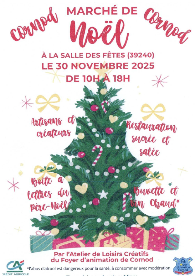 Dimanche 30 novembre 2025 de 10h à 18h, venez découvrir le Marché de Noël de Cornod proposé par l'Atelier de Loisirs Créatifs du Foyer d'animation de Cornod.Date :